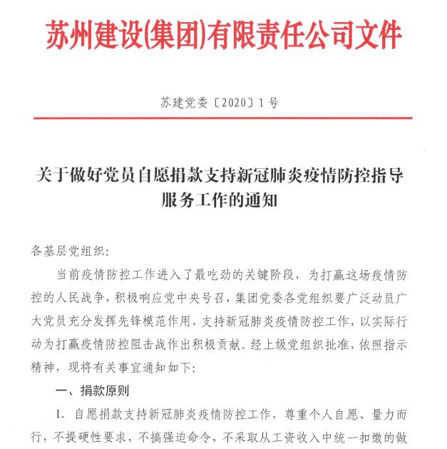 苏州建设集团党委支持新冠肺炎疫情防控工作捐款倡议书