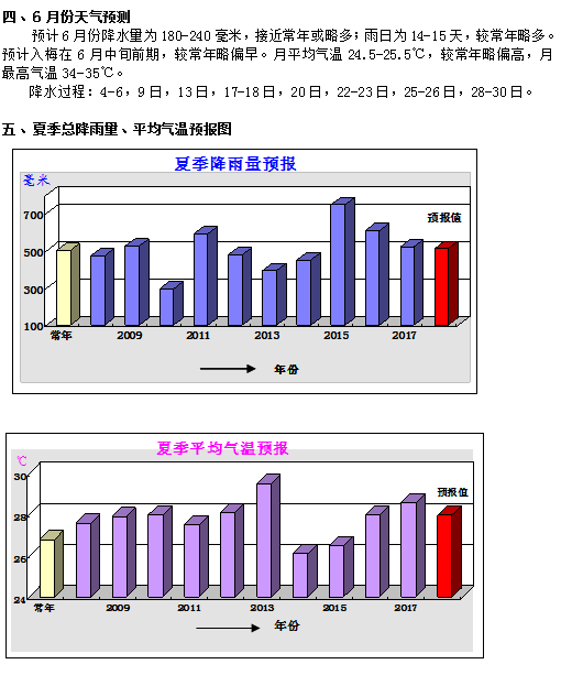 预计入梅在6月中旬前期,较常年略偏早,出梅在7月上旬,较常年正常或略偏早,梅长22-24天,接近常年,梅雨量180-220毫米,较常年略偏少。